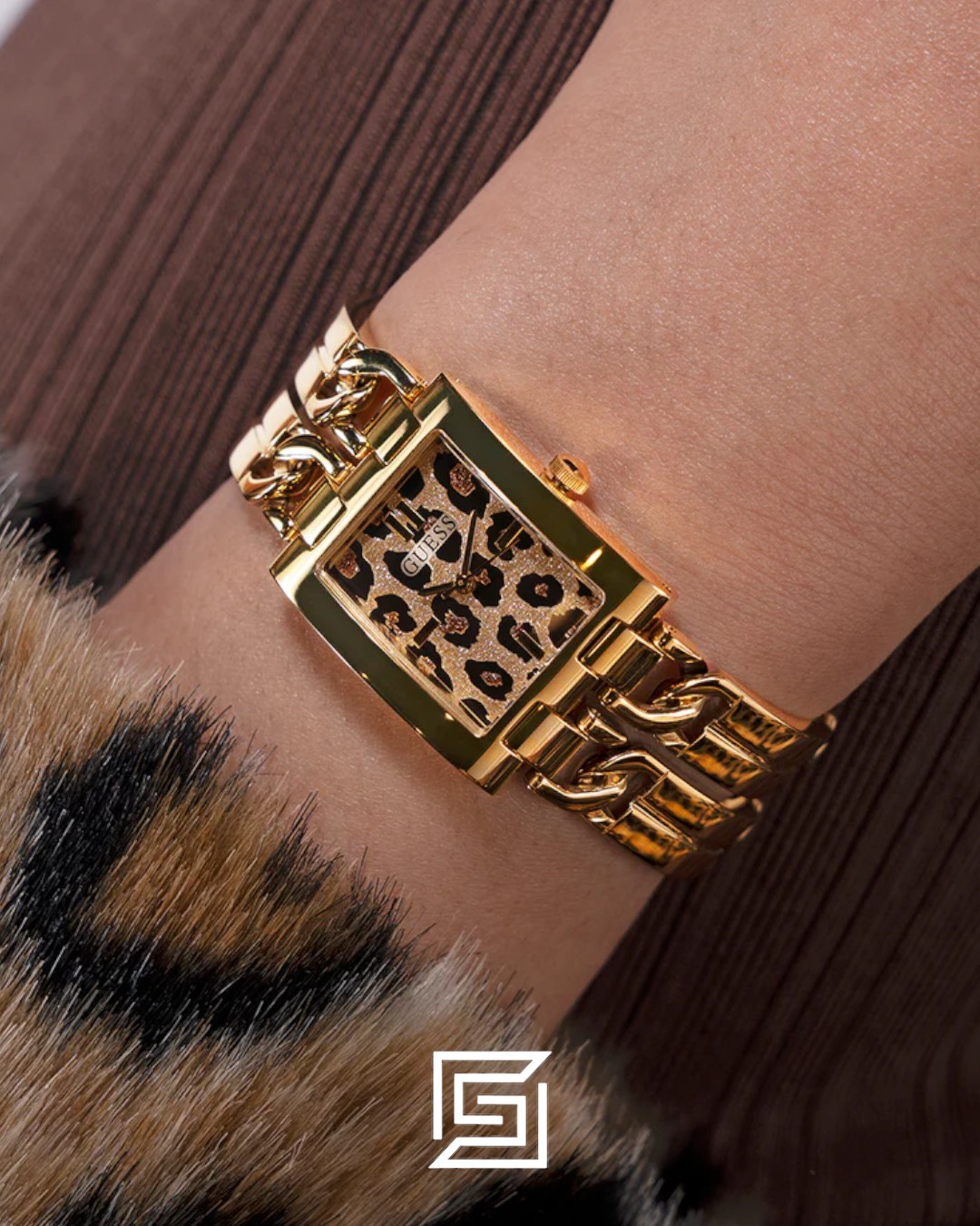 Stylish Guess GW0807L2 women’s watch. Rectangular case, gold-toned stainless steel band with animal print dial & stones. Mineral glass, quartz movement, 3 bar water resistance. 1-year warranty.