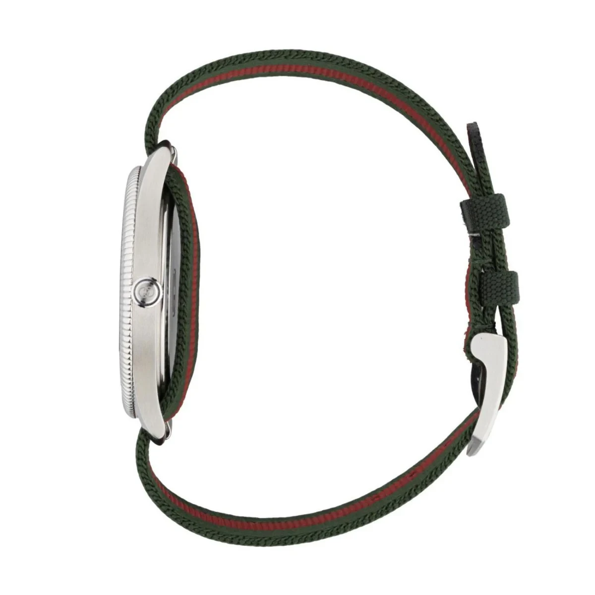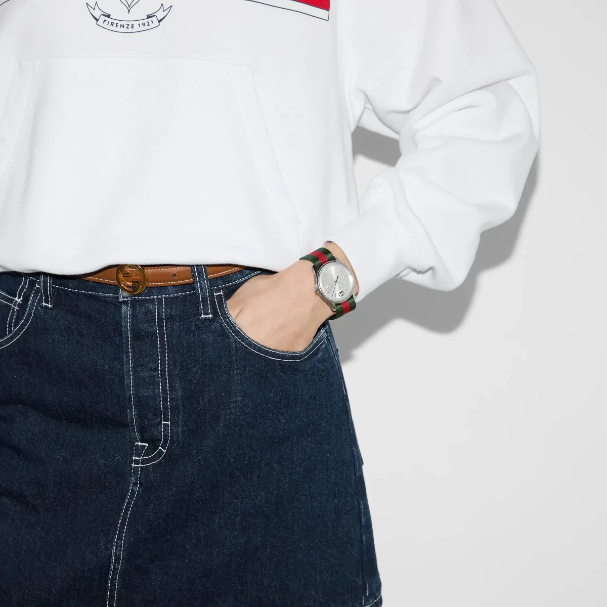 The G-Timeless line continues to define the latest collections, highlighting the signature motifs of the House. Presented with a green and red nylon strap, the accessory features a stainless steel case and a silver-toned dial enriched with emblematic codes.