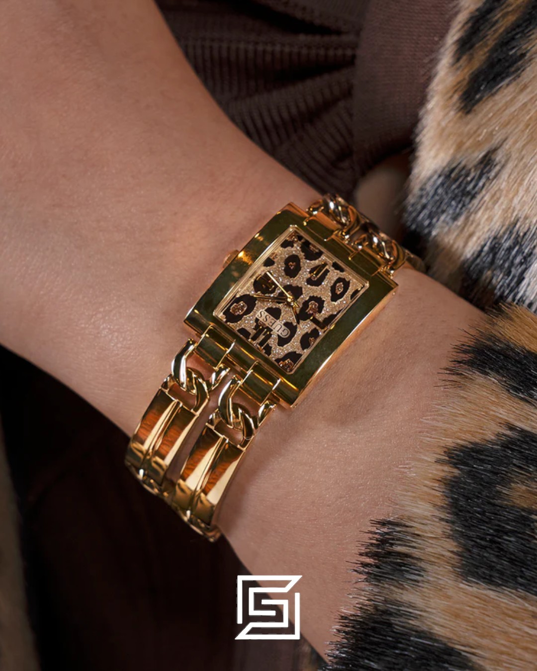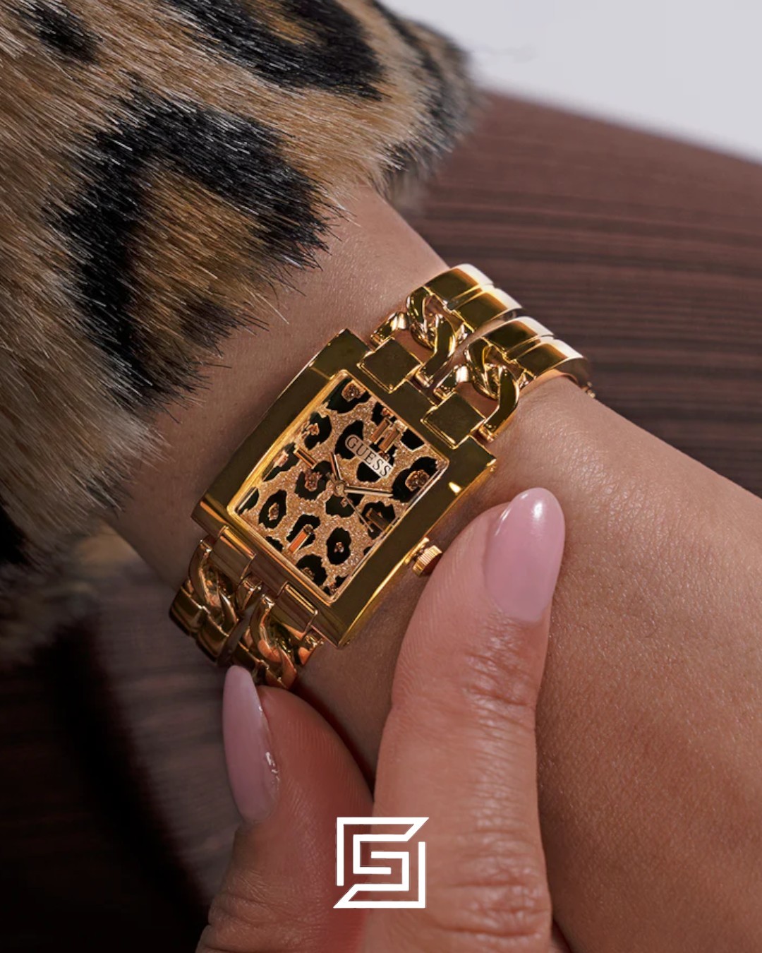 Stylish Guess GW0807L2 women’s watch. Rectangular case, gold-toned stainless steel band with animal print dial & stones. Mineral glass, quartz movement, 3 bar water resistance. 1-year warranty.